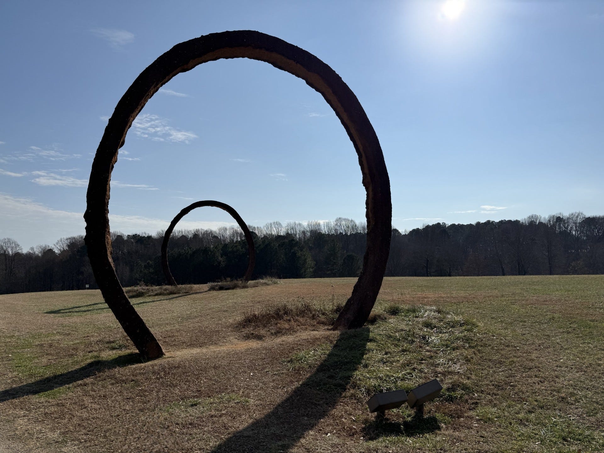 It’s finally here. After discovering what Santa left in our stockings and enjoying our traditional Christmas Day breakfast of sausage roll, Moravian sugar cake, and ambrosia, my husband and I are taking a leisurely walk through the central part of the NCMA park. The weather is so mild we don’t need coats; some people are even wearing shorts. Along the way, I point out some of the pieces I’ve already written about in this blog, including Mark di Suvero’s bright red exclamatory Ulalu that punctuates the museum entrance and Thomas Sayre’s earthy Gyre that spirals through the Upper Meadow.